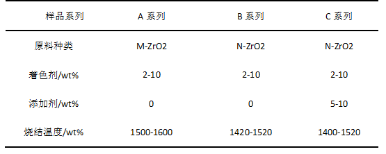 眾所周知,普通彩色陶瓷的制備一般是將色料或著色劑加入到陶瓷坯體或釉料中,通過高溫燒成(一般低于1300℃)而獲得。而氧化鋯陶瓷的燒結溫度較高,一般在1550~1650 ℃。在此溫度下,大多數(shù)的色料或著色劑會分解、揮發(fā)。因此,采用簡單添加色料或著色劑的方法,難以制得呈色鮮艷的彩色氧化鋯陶瓷。、 要解決此問題,一方面需通過適當?shù)拇胧┙档蜔Y溫度,另一方面要添加合適的著色劑及助劑抑制著色劑的分解、揮發(fā)。
