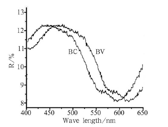 采用紫外-可見光譜儀對制品顏色進行分析,圖中BV 曲線是所制備藍色陶瓷的可見光反射曲線。制品在475nm 具有較強的反射,這是釩鋯藍色料的特征顏色。(備注:BC為如下第三點的數(shù)據(jù)。)