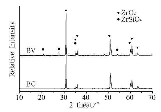 可見采用釩鋯藍色料制備的ZrO2 陶瓷(BV) 其主晶相為四方相ZrO2,還有很少量的硅酸鋯相。說明高溫燒結沒有使硅酸鋯分解,陶瓷的呈色是由色料導致。而采用Co3O4制備的藍色ZrO2陶瓷(BC) 中只有四方相ZrO2,沒有其他雜相。陶瓷的呈色可能是由于Co 溶入ZrO2 晶格中導致。